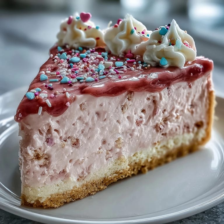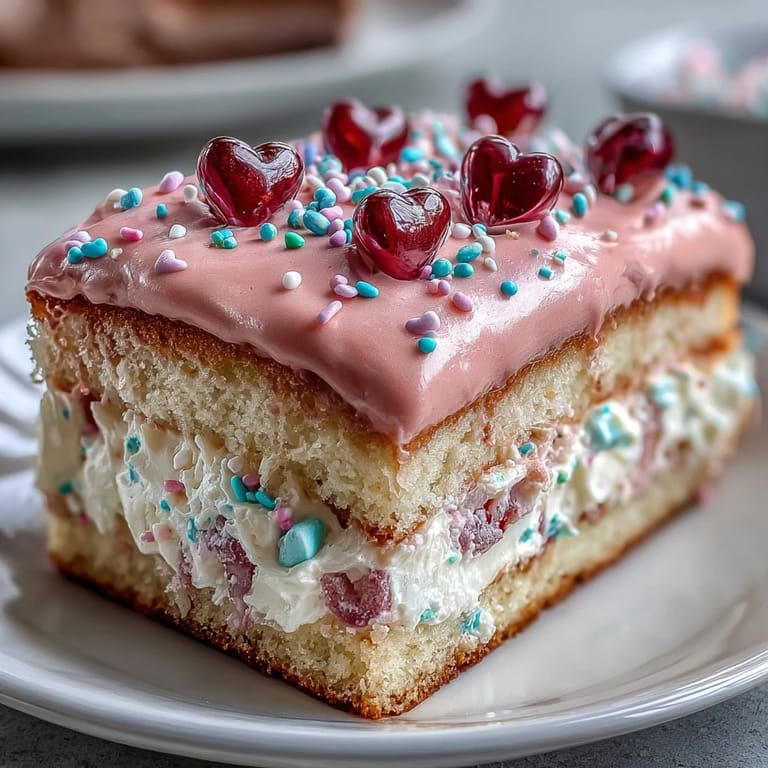 Save The first time I sliced into this cake, the layers held their shape so cleanly I almost didn't want to disturb them. Then I handed a plate to my best friend and watched her face light up at the contrast between the creamy filling and the crunchy candy shell. She said it tasted like Valentine's Day and childhood wrapped into one fork-full, and I couldn't have described it better myself.