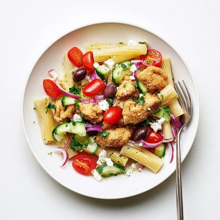 Save The sun was hitting my kitchen counter just right when I first threw together this Mediterranean mashup. I had leftover Greek salad components and some chicken that needed cooking, so I decided to see what would happen if they met in the same bowl with pasta. The crunch of perfectly fried chicken against cool crisp vegetables and warm noodles turned out to be one of those happy accidents that immediately went into regular rotation.