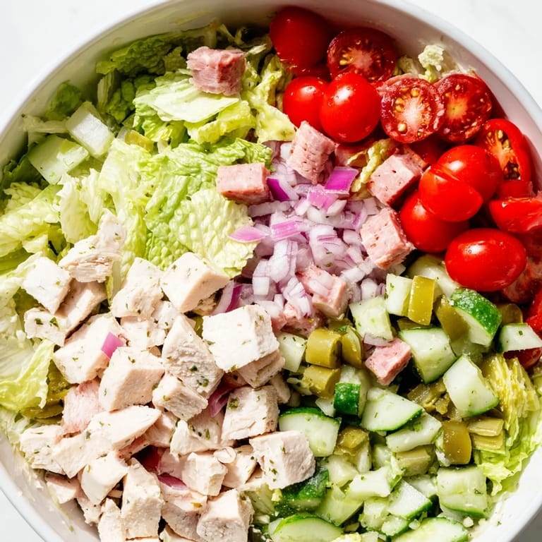 Turkey breast works wonderfully as a lighter alternative. For a vegetarian version, omit the chicken and salami entirely, adding chickpeas or white beans for protein. You could also use diced mozzarella instead of provolone for a milder flavor profile.